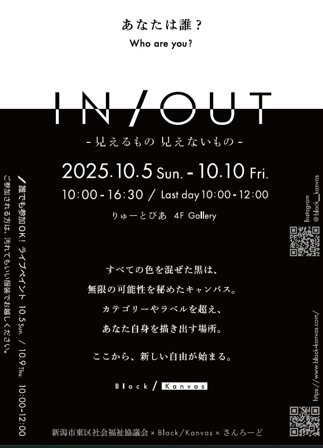 10/5(日)~10/10(金)、りゅーとぴあ4階ギャラリーにてBlack/Kanvas (ブラックキャンバス) ボップアップ「in/out見えるもの見えないもの」展を開催します。
